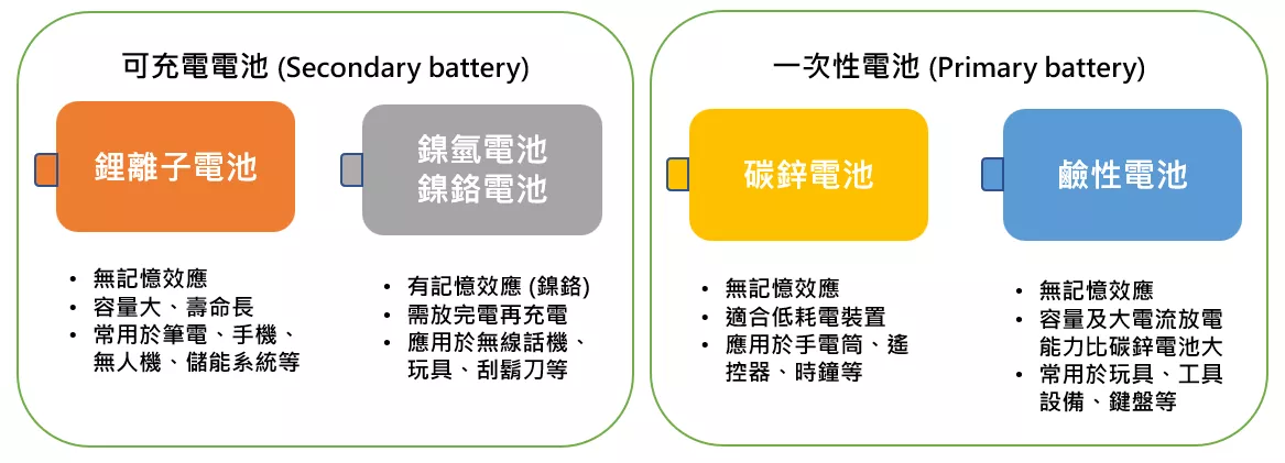 鋰離子電池與其他常見電池特色比較