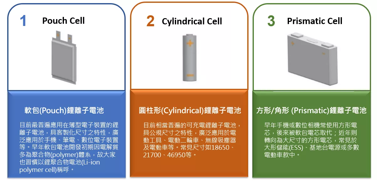 鋰離子電池(Li-ion battery 或是Lithium ion battery)是一種利用鋰離子在正極和負極之間移動來儲存和釋放電能的可充電電池(rechargeable battery或稱secondary battery),具重覆使用特性,與一次性電池(或稱primary battery)不同。鋰離子電池因具備高能量密度、無記憶效應、良好的壽命及更環保等優點,是手機、筆記本電腦及電動車等多種移動式設備的主流電池選項。根據封裝及外觀型態不同,常見的鋰離子電池芯(Li-ion cell)又分為: