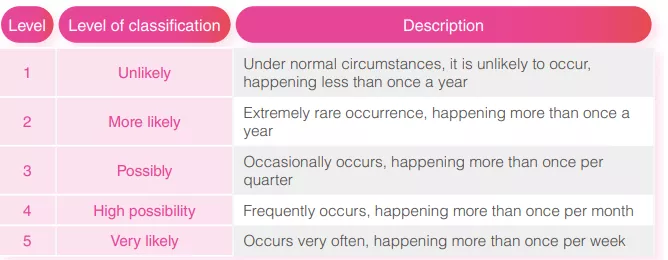 Through the questionnaire, ratings from 1 to 5 points are given according to the actual "probability" and "severity" to assess the potential impact.