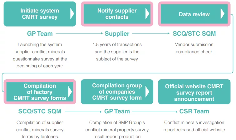 The management and due diligence survey results of conflict minerals in the supply chain have identified 226 3TGs smelters, 53 cobalt mines, and 3 mica smelters. The smelter/ refinery list announced on the official website of the Responsible Minerals Initiative (RMI) is subject to change as smelters may be removed from the qualified list due to closure, withdrawal from the RMAP (Responsible Minerals Assurance Process) program, or suspension of production.