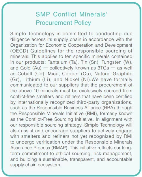 Simplo Technology requires suppliers to follow the "Due Diligence Guidance for Responsible Supply Chains of Minerals from Conflict-Affected and High-Risk Areas" published by the OECD and conduct due diligence based on this Guidance. At the same time, we have introduced RPA automation to regularly monitor the latest smelter information published on the RMI's official website, ensuring that our system maintains the most complete data. We adopt automation management on a rolling basis to ensure that the submitted data from vendors complies with the latest regulations and customer requirements.