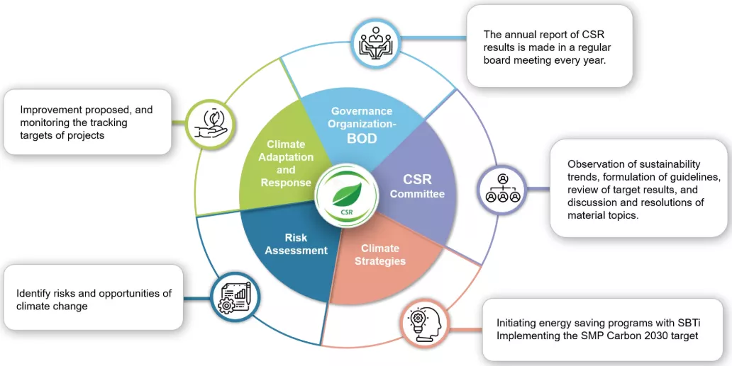 Simplo Group references the core elements of TCFD for disclosing information related to “climate governance, strategy, risk management, and goals”. This helps assess climate-related risks and opportunities affecting business operations, formulate strategies and actions to address climate change, enhance transparency in disclosure, and implement corporate climate governance effectively.