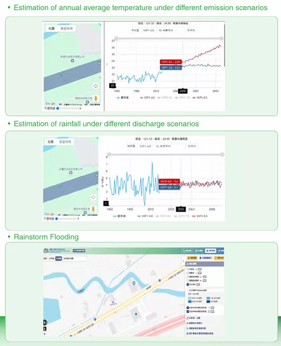 • Taking into account GHG emissions from four different social and economic scenarios, including SSP1-2.6 low emissions scenario, SSP2-4.5 moderate emissions scenario, SSP3-7.0 high emissions scenario, and SSP5-8.5 very high emissions scenario, these scenarios project changes in annual average temperature, daily maximum temperature, and precipitation in Taiwan by 2050.