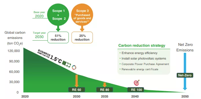 1. Passed the review of the SBTi (1.5 ℃ near-term) target, using 2020 as the base year, aim to reduce absolute Scope 1 and 2 GHG emissions by 51% by 2030. Additionally, reduce absolute Scope 3 emissions related to “purchased goods and services” by 25%. |